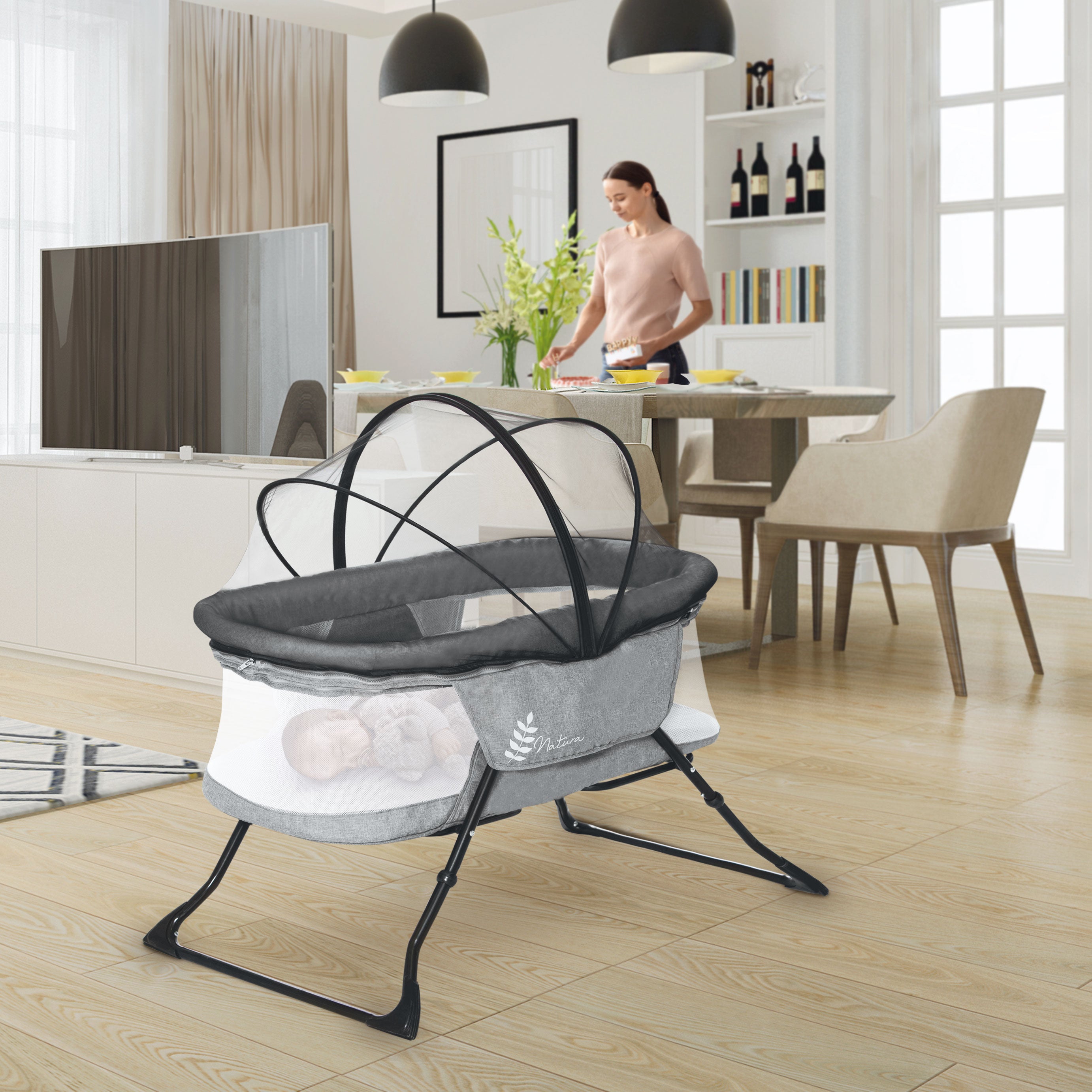 Sur les deux côtés se trouvent des panneaux en maille qui aident à améliorer la circulation de l'air, à garder bébé à l'aise et en vue pour que papa, maman et bébé puissent se reposer plus facilement, sans stress.